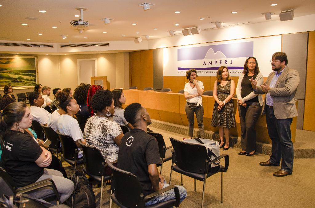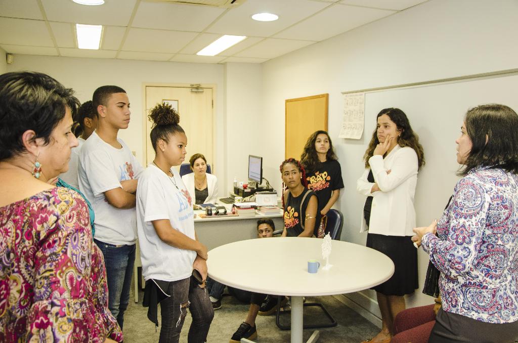 A assessora e a assistente da Assessoria de Direitos Humanos e Minorias (ADHM/MPRJ), promotoras de Justiça Eliane de Lima Pereira e Roberta Rosa, respectivamente, foram as responsáveis por acompanhar os adolescentes pelas dependências do MPRJ para que eles conhecessem o trabalho realizado em diversas áreas, mais especificamente nas áreas de violência doméstica, infância e juventude e educação . Os jovens também foram conhecer de perto o funcionamento do “MP em Mapas”.