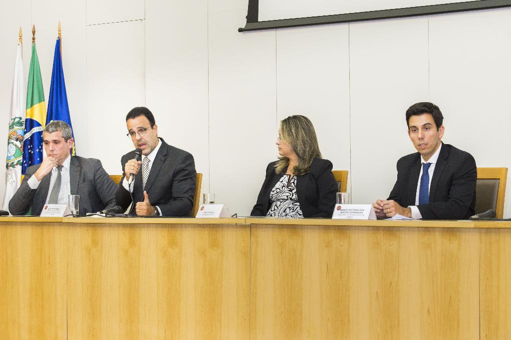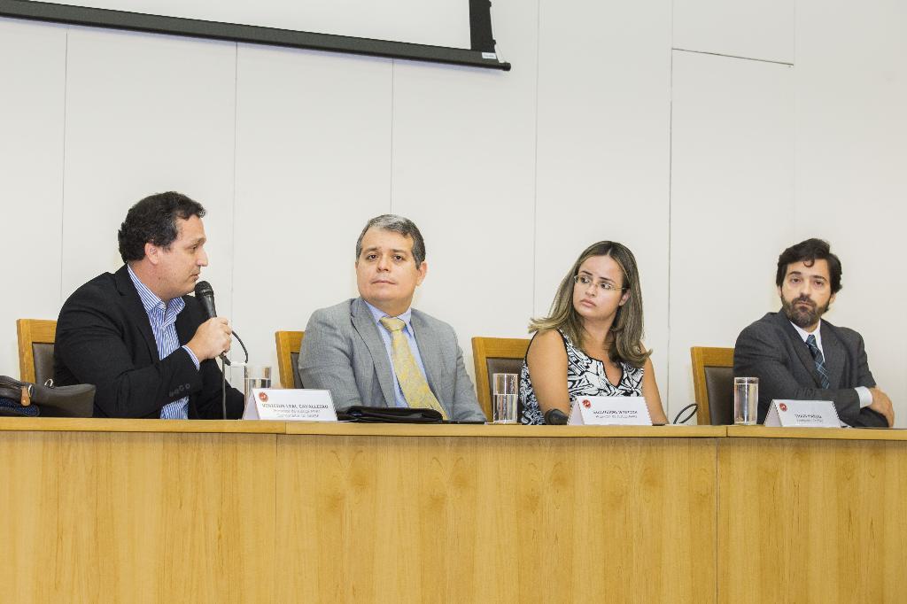 O promotor de Justiça Guilherme Martins e a advogada Thais Marçal, coordenadores do evento, receberam na primeira mesa o coordenador do Grupo de Atuação Especializada no Combate à Sonegação Fiscal e aos Ilícitos contra a Ordem Tributária (GAESF/MPRJ), promotor de Justiça Vinicius Leal Cavalleiro; e o promotor de Justiça Rogério Pacheco Alves, da 3ª Promotoria de Justiça de Tutela Coletiva de Proteção à Educação da Capital. Eles discorreram sobre os avanços da lei.