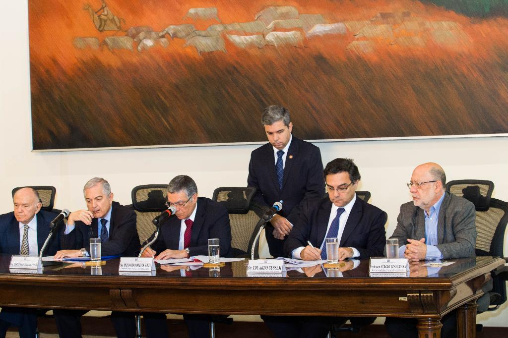 O Ministério Público do Estado do Rio de Janeiro (MPRJ) e o Tribunal de Justiça do Estado do Rio de janeiro (TJRJ) assinaram, nesta terça-feira (12/12), um Termo de Convênio que tem por objetivo a cooperação para compra compartilhada entre as instituições. O acordo foi assinado pelo procurador-geral de Justiça, Eduardo Gussem, e pelo presidente do TJRJ, desembargador Milton Fernandes, durante a apresentação do Balanço Sustentável do Tribunal de Justiça. Também compuseram a mesa o procurador-geral do Tribunal de Contas do Estado, Sérgio Cavalieri, o desembargador Jessé Torres Pereira Junior e o economista Sérgio Besserman, presidente do Jardim Botânico do Rio.
