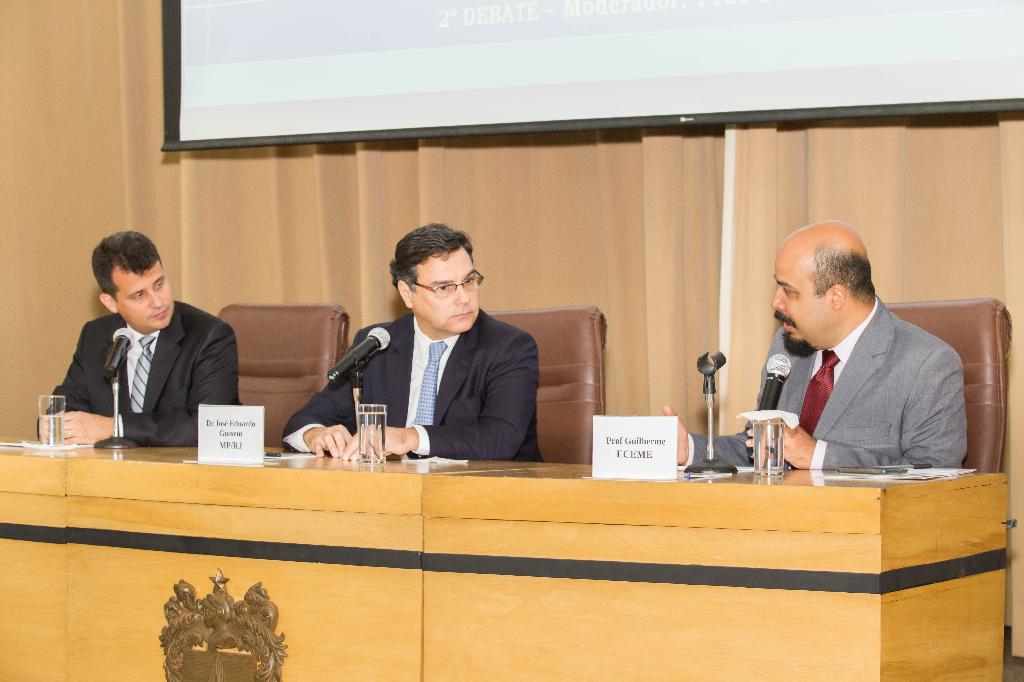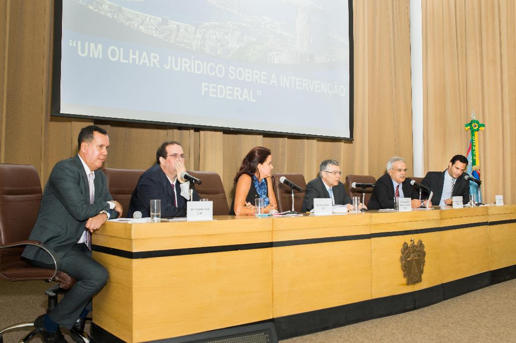Luciano Moreira Gorrilhas, do Ministério Público Militar. apontou medidas que considera indispensáveis para que o regime de exceção na segurança do Rio surta efeitos. “É preciso atacar as milícias, vigiar as fronteiras, portos e aeroportos, promover incursões em comunidades e monitorar o sistema penitenciário”, enumerou o procurador de Justiça. Também participou desta mesa Ana Valéria de Andrade Rabêlo, consultora Jurídica da União no Rio, que falou sobre a segurança jurídica do decreto 9.288, que trata da intervenção, com validade até 31 de dezembro. “Em conjunto, atuamos na verificação da legalidade dos atos e ações, sempre com os compromissos firmados pela AGU”, resumiu ela, que acredita ser necessária utilizar ‘mandados de busca em determinados perímetros’ em algumas operações, e dividiu a sua apresentação com os advogados Cláudio Vicentino e Claudio José Silva.