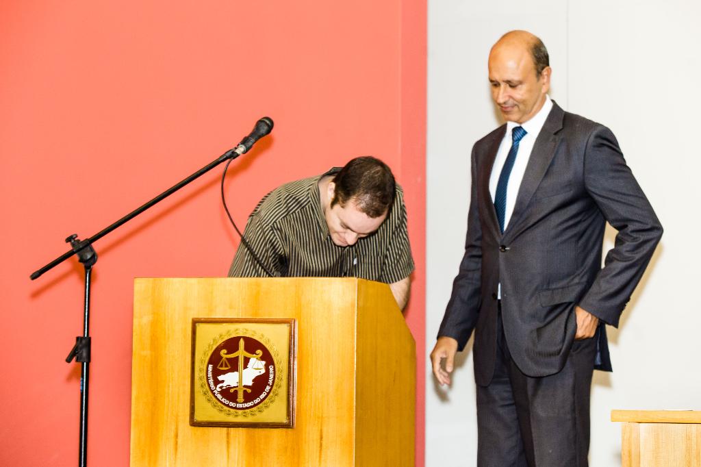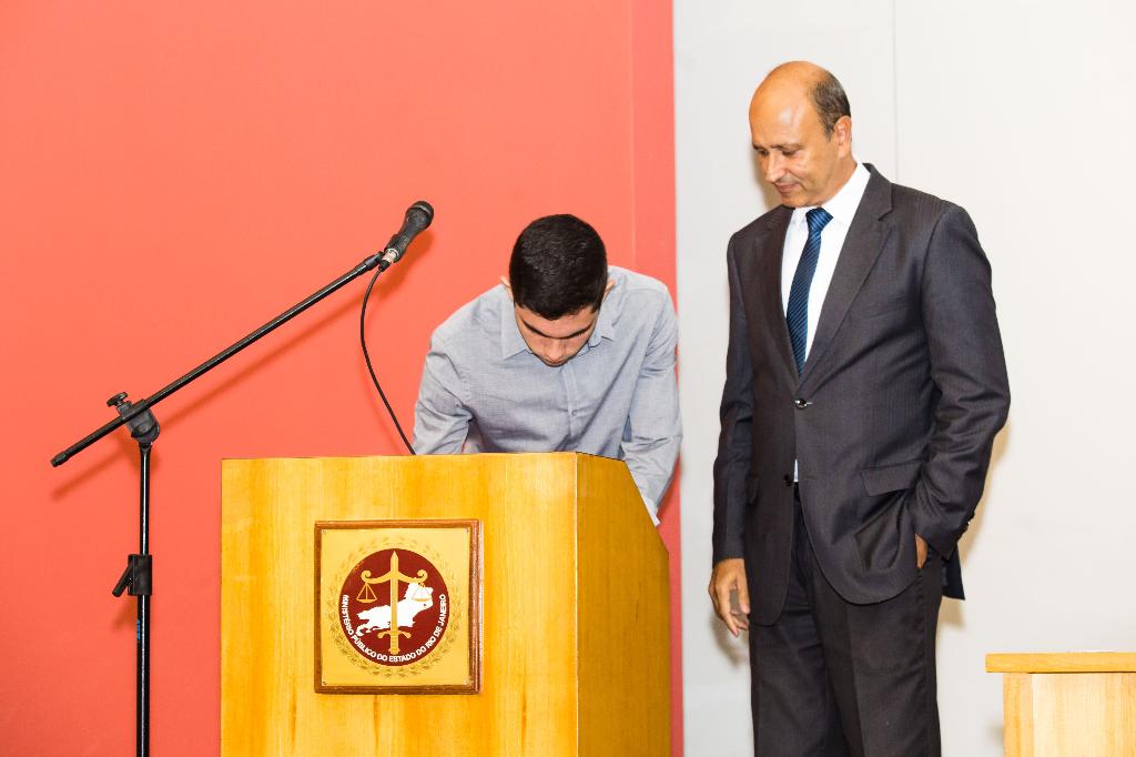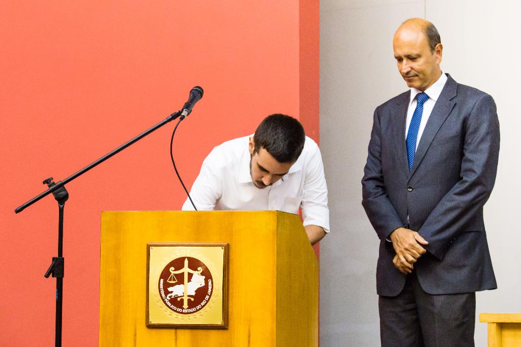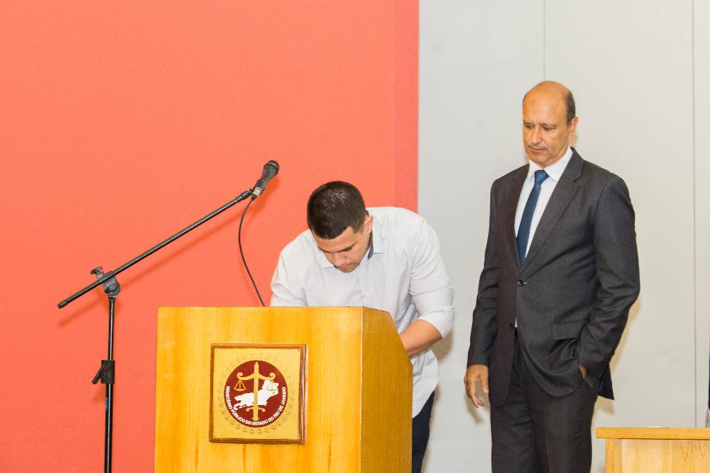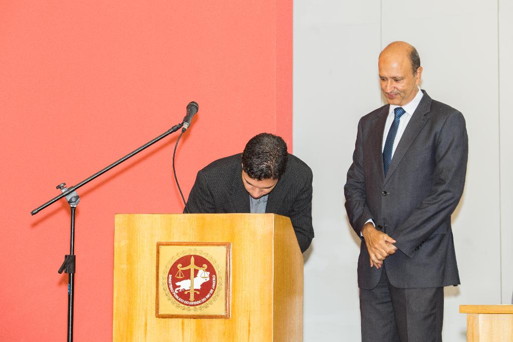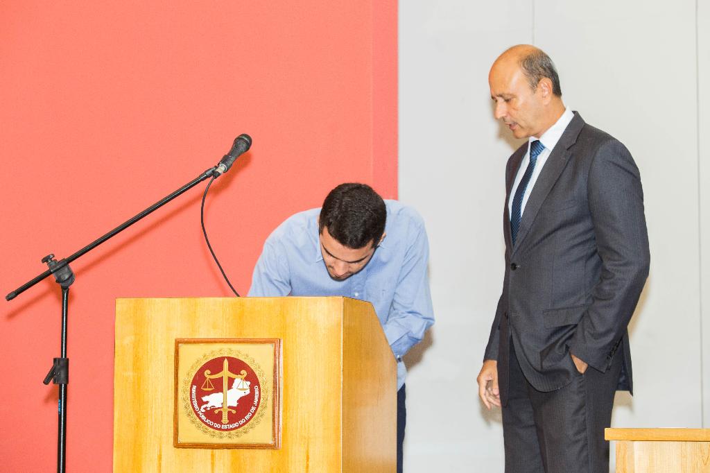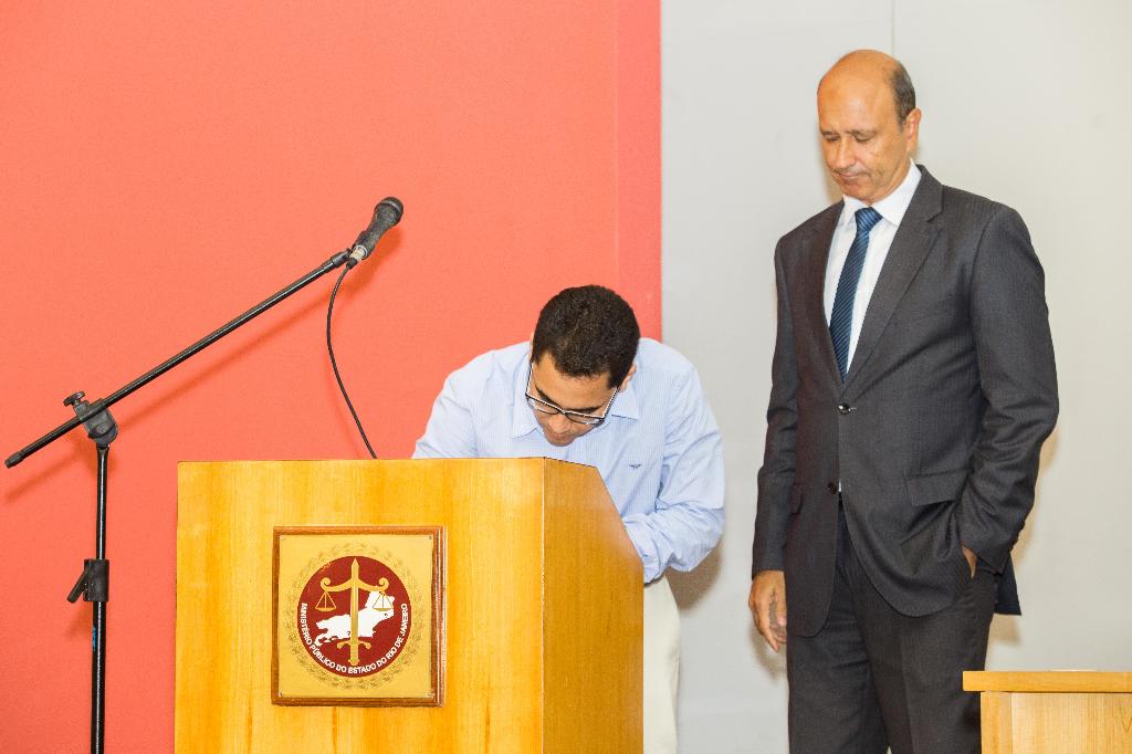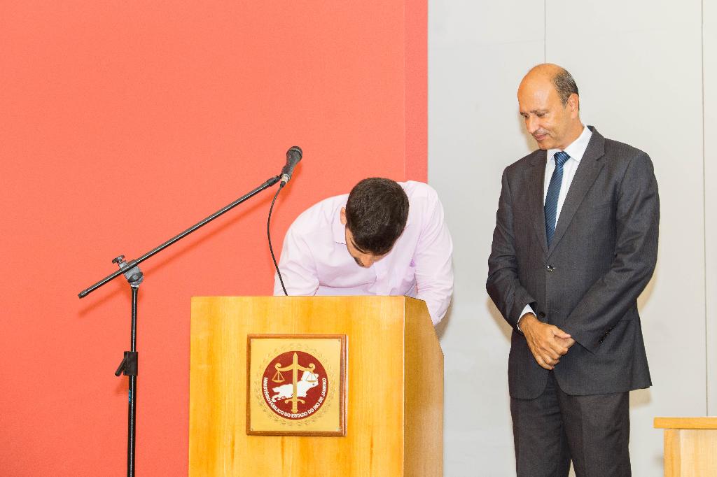 O secretário-geral do MPRJ, promotor de Justiça Dimitrius Viveiros Gonçalves, leu o termo de posse e convidou os novos servidores para a assinatura do documento. Em nome dos colegas recém-empossados, Tomás Dias Barreto, exaltou o dever cívico dos cargos que assumiram hoje.