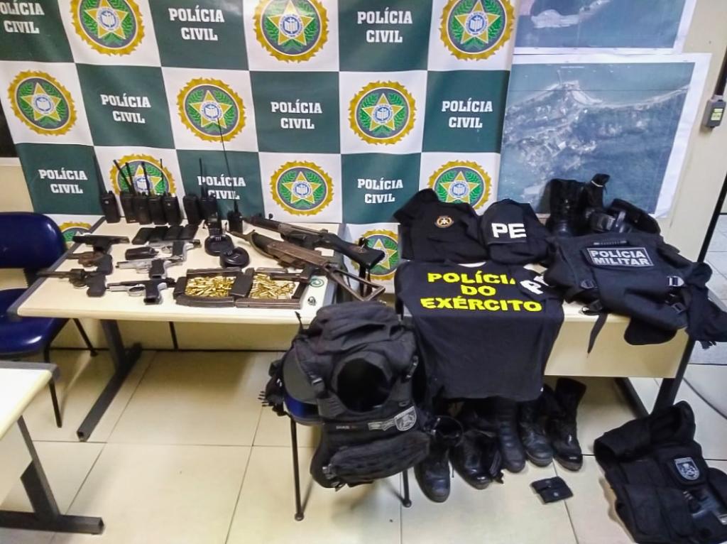 No apartamento dele foram apreendidos 4 pistolas, 2 revólveres, 1 submetralhadora MP5, 1 submetralhadora 9mm, 10 rádios transmissores e muitas fardas de forças de segurança e coletes.