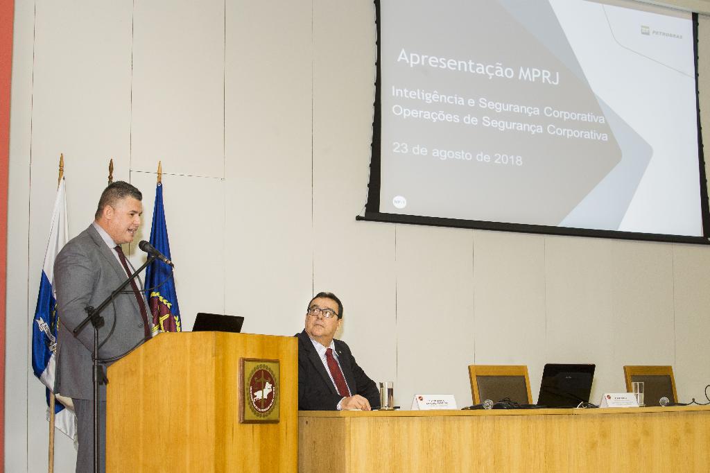 A primeira palestra do dia reuniu o coordenador de Operações da Segurança Corporativa da Petrobras, Eduardo Borges, e o gerente da área de Inteligência e Segurança Corporativa (ISC) da empresa, Luiz Roberto Furtado. Eles comentaram as principais atividades de segurança corporativa e os desafios da segurança dentro de uma empresa tão grande. Eles citaram a importância do relacionamento com outras instituições, entre elas o MPRJ. “Nos desvios de produtos dos dutos trabalhamos firme com apoio do GAECO/MPRJ ( Grupo de Atuação Especial de Combate ao Crime Organizado). Essa ponte que construímos com o Ministério Público e outros órgãos de segurança pública é fundamental”, comentou Eduardo Borges.