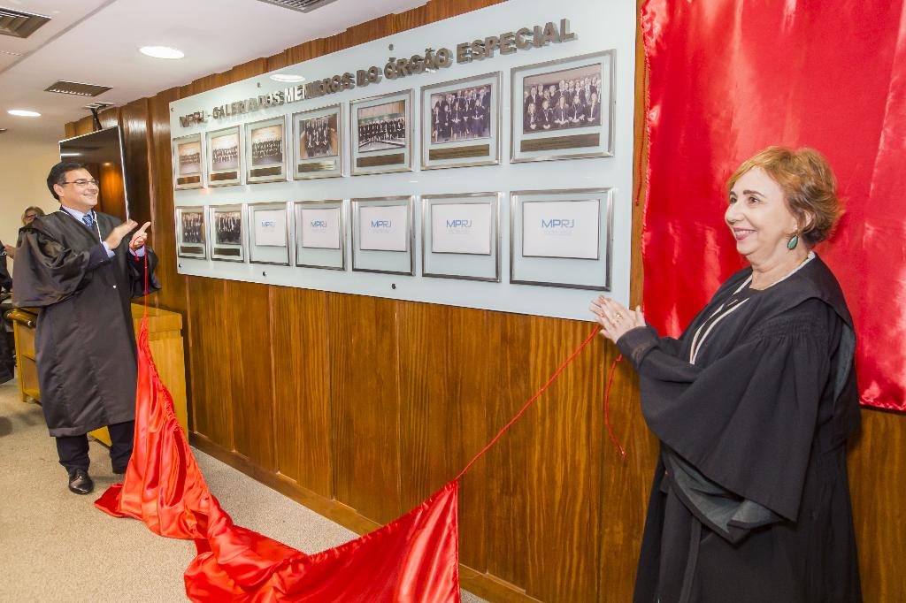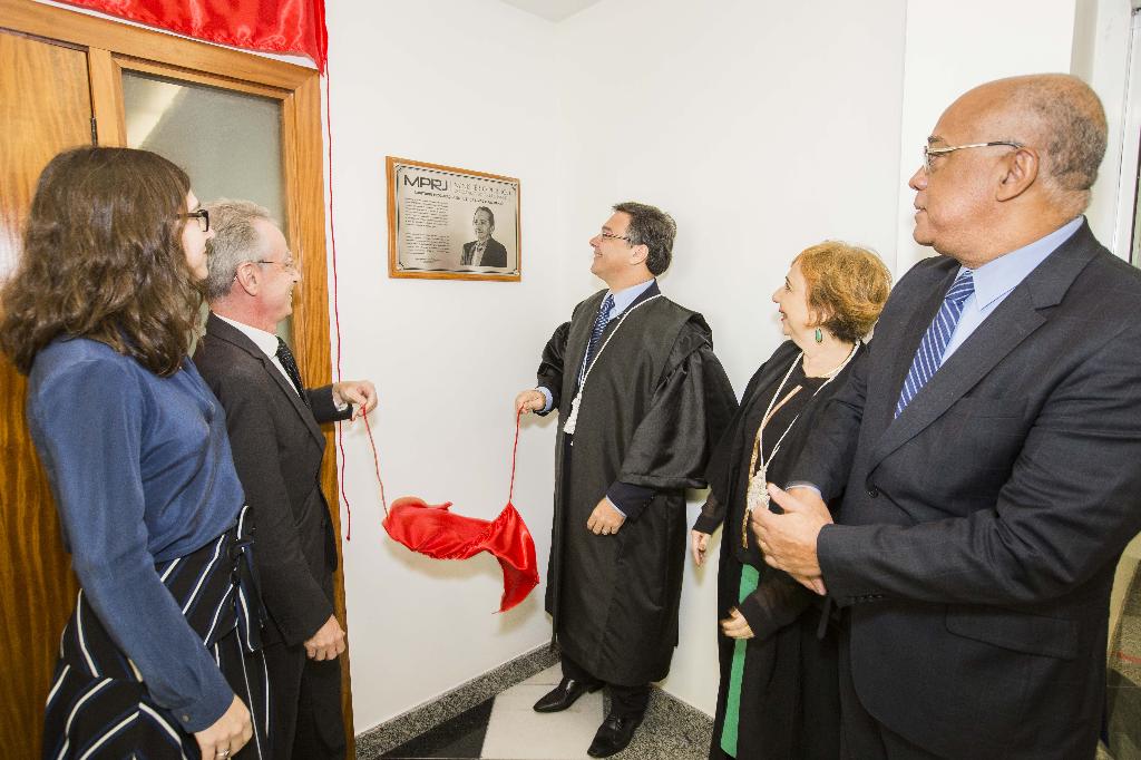 Em seguida, foram inauguradas as novas galerias de retratos dos membros dos Órgãos Colegiados do MPRJ e a placa do Auditório Procurador de Justiça Simão Isaac Benjó. O PGJ descerrou os painéis e a placa ao lado do procurador de Justiça Ricardo Martins, decano do Conselho Superior do Ministério Público, da procuradora de Justiça Maria Cristina Tellechea e de Roberto Benjó.
