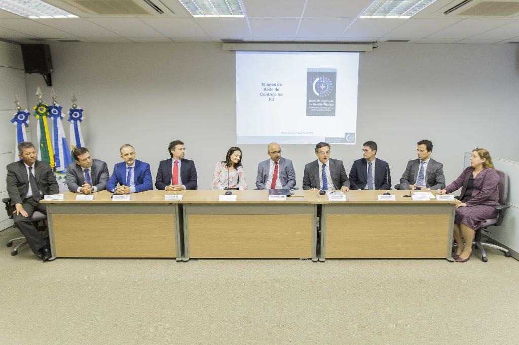 O Ministério Público do Estado do Rio de Janeiro (MPRJ) participou, na tarde de quinta-feira (27/06), da assinatura do termo de renovação, por cinco anos, da Rede de Controle da Gestão Pública, centro que reúne instituições com o objetivo de desenvolver ações de fiscalização dos gastos públicos, incluindo diagnóstico e combate à corrupção, incentivo e fortalecimento do controle social, e compartilhamento de informações e documentos. No caso do Estado do Rio, a Rede de Controle acaba de completar dez anos. Com a assinatura do termo, houve a inclusão de três participantes: Polícia Federal, Controladoria-Geral do Estado e Procuradoria-Geral do Estado – somando 15 instituições.