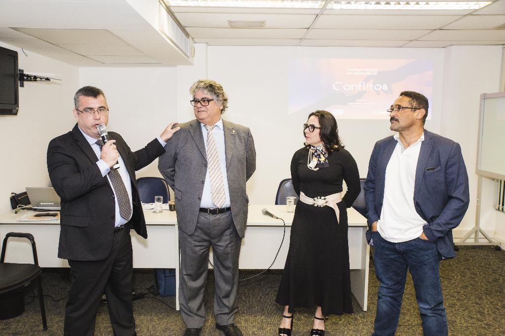 O Ministério Público do Estado do Rio de Janeiro (MPRJ), por meio do Centro de Mediação, Métodos Autocompositivos e Sistema Restaurativo (CEMEAR/MPRJ), em parceria com o Ministério Público do Trabalho (MPT), iniciou nesta sexta-feira (02/08) o Curso de Capacitação em Mediação de Conflitos. A aula inaugural contou com a presença da coordenadora do CEMEAR/MPRJ, procuradora de Justiça Ana Maria Di Mais; do procurador-chefe do MPT-RJ, Fabio Villela; do coordenador nacional do CONALIS, João Hilário; e do procurador do trabalho, João Carlos Teixeira.