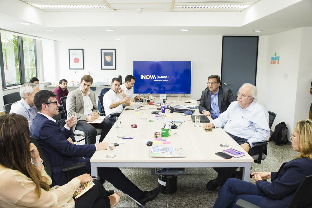 O Ministério Público do Estado do Rio de Janeiro (MPRJ), por meio do Laboratório de Inovação (Inova/MPRJ), recebeu, nesta quarta-feira (04/12), quatro especialistas em inovações no setor público para troca de informações sobre a estratégia de inovação e pesquisa no MP fluminense. Chamado de Antena MPRJ, o evento reuniu o ex-presidente da Escola Nacional de Administração Pública (Enap), Francisco Gaetani; o diretor de Inovação e Gestão do Conhecimento da Enap, Guilherme de Almeida; o coordenador de Governança e Capacidades Estatais do Instituto de Pesquisa Econômica Aplicada (Ipea), Pedro Cavalcante, e o gerente do Programa Cidades e Territórios do Instituto Arapyaú, Marcelo Cabral.